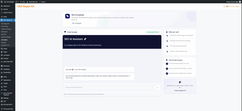 The premium version of SEO Repair Kit includes an AI SEO Chatbot. This intelligent assistant is ideal for optimizing content, answering SEO-related questions, and suggesting improvements in real time.