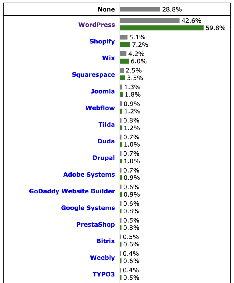 WordPress’s market share decreased to 59.8% to be specific – if you only consider websites running a known CMS. This includes websites running WordPress.com.