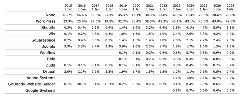 WordPress market share: how many websites use WordPress in 2026?